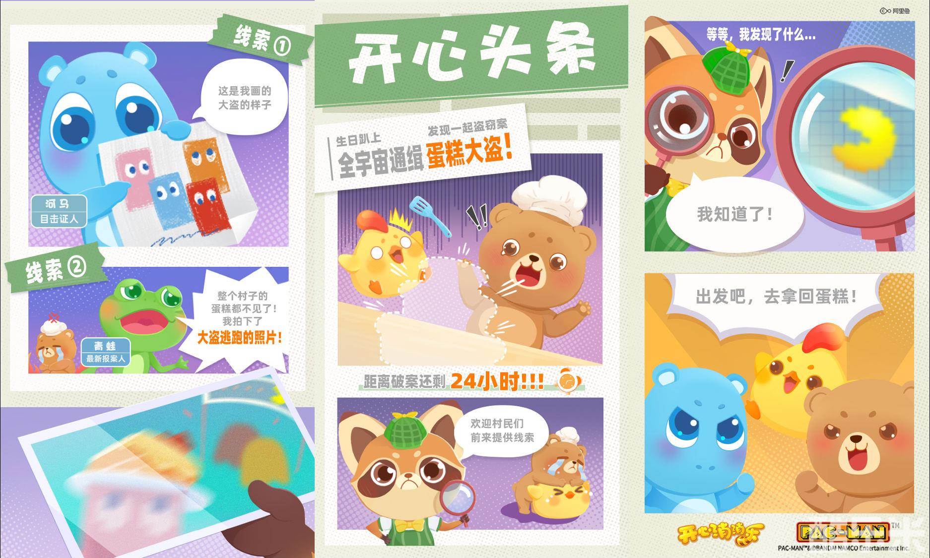 在《开心消消乐》x《吃豆人》联动悬念图中,《吃豆人》里馋生日蛋糕的幽灵们游荡到消消乐的小动物们的庆生现场哄抢蛋糕。小动物们发现蛋糕不见了,梳理发现线索,终于锁定了大盗的身份——吃豆人的对手幽灵们。小动物们追捕抢糕大盗,竟然来到了吃豆人的星球,趣味故事引发了玩家们对于联动活动的热烈期待。