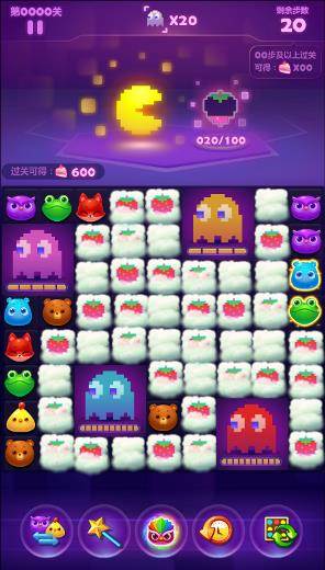 在玩法方面,玩家还可以带着吃豆人在《开心消消乐》中闯关,融合了经典消消乐玩法和吃豆人元素的《蛋糕争夺战》,为玩家们带来别具一格的新鲜体验。关卡设计和副本面板设计中加入了吃豆人元素,你可以携带吃豆人一同闯关,当消除掉云朵中的水果为吃豆人充能后,吃豆人就会释放三种不同的技能,帮助你爽快消除!