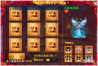 每天花费一定元宝即可抽取各种日常道具,每轮第一次免费。 每轮抽完必定仙女之玉(合成新仙女幻化卡) 每天最多可花费元宝重置活动5次。 每日0点重置活动。