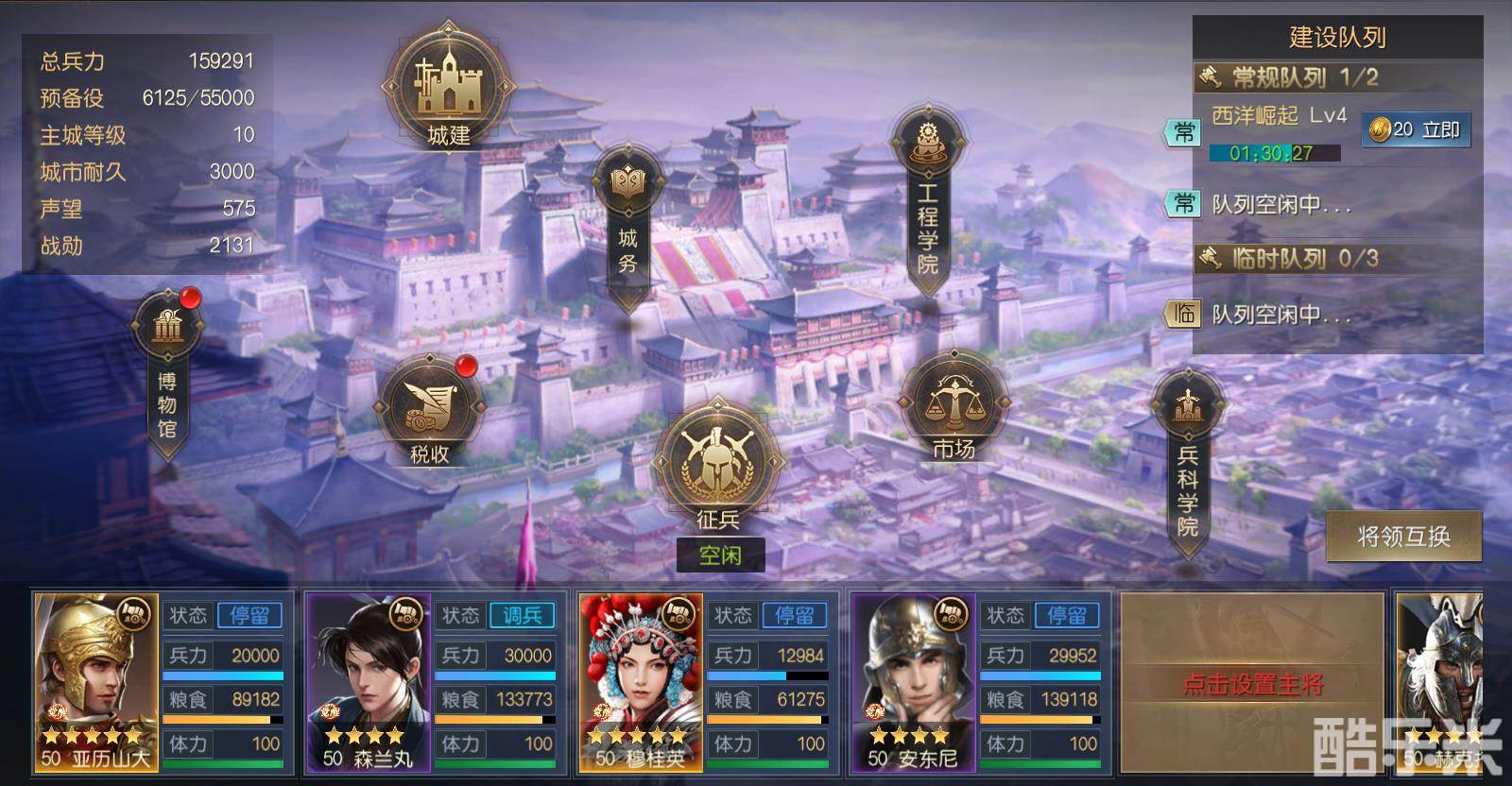 【税收】是玩家前期重要的经济来源,可以获得大量银币,随着居民建筑等级的提升,税收金额也会慢慢增长。通过【征兵】能消耗资源征集预备役,【兵科学院】与【工程学院】则可以研究、升级部队器械和阵型。