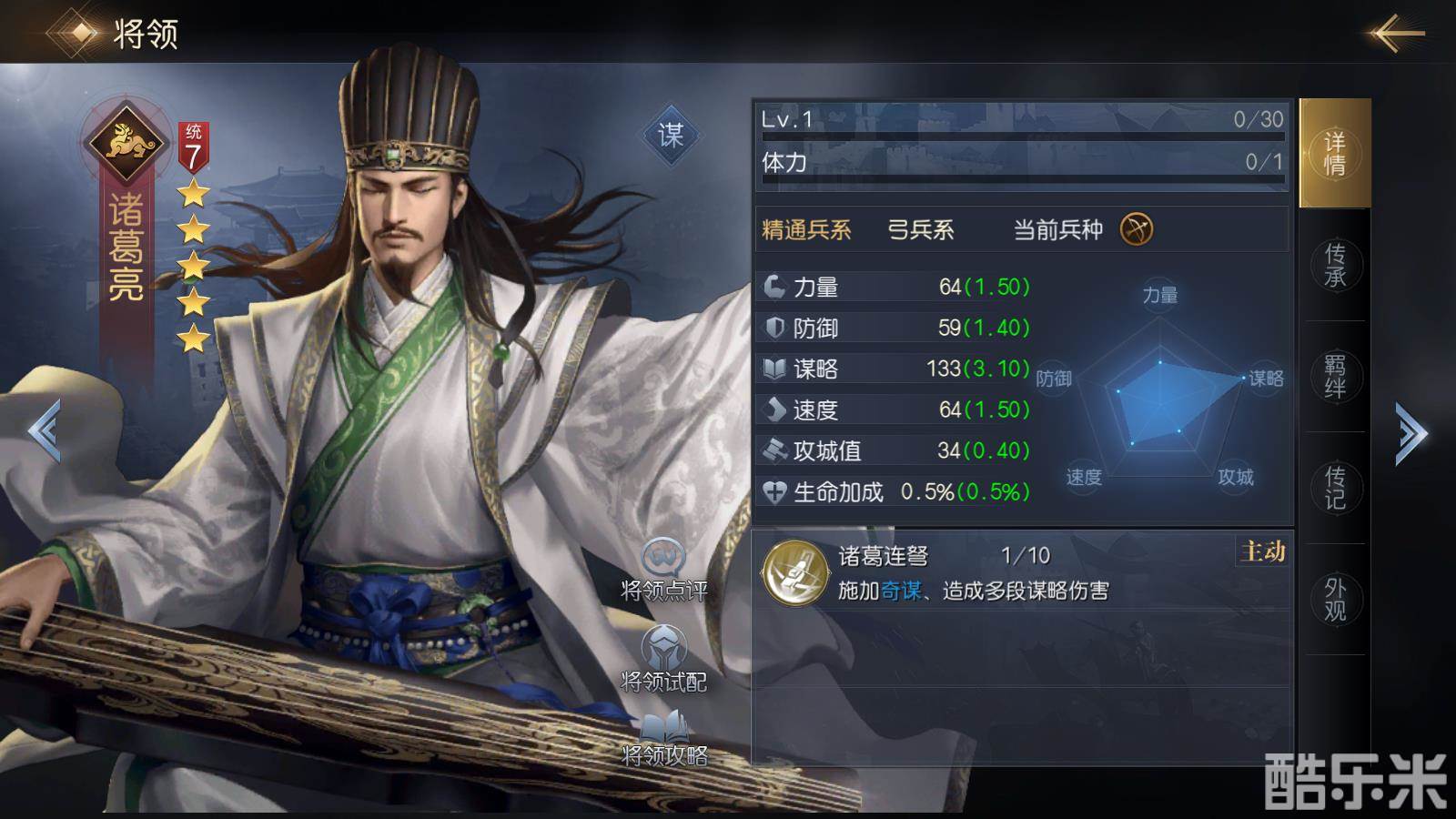 诸葛亮的技能【诸葛连弩】发动之后可以触发三次单体伤害,每次独立选择目标,总伤害率达到450%,配合他3.1的谋略成长能够打出高于面板水平的实际输出,诸葛亮作为主将时,技能发动还能获得20%【奇谋】效果,可提高其所有技能的爆发率。