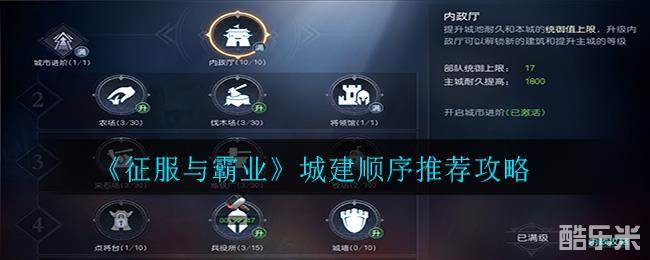 有针对性地对一些建筑进行升级可以快速提高自己部队的作战能力,或是提高某种资源的产出速度。正确的升级路线可以避免物质等待和浪费,同时加快自己的发育进度,下面小编就给大家带来《征服与霸业》城建顺序推荐攻略。