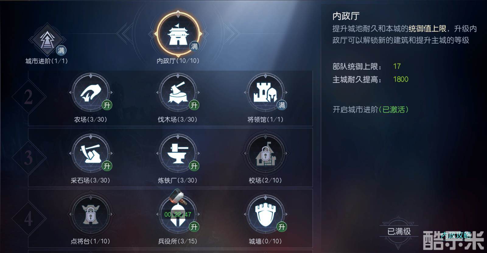 内政厅7级后就不用太着急升级内政厅,除非心仪的满编队因统御限制无法上阵,那么可以升到8级解锁统御厅。9、10级建筑中只有兵科学院与文明兵种有实用性,建议达到8级内政厅即可,到后期资源充足再考虑升级。