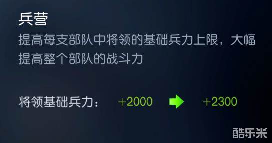 前期城建以内政厅7级为首要目标,7级后可解锁兵营,该建筑可直接提升将领的基础兵力上限,可让将领拥有更强的基础战斗力,能从多个方面减轻我们的压力,1是可让低等级将领直接在野地进行扫荡,极大的减少了练级时的频繁操作,2是达标高级地要求,从6级地开始,野地兵力都是超过等级标准的,升级兵营比练级、抽卡都更快更有效,可更快的开荒高级野地。