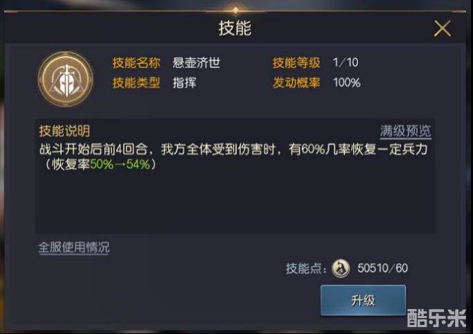 华佗作为游戏中强力的医师型将领,其自带技能【悬壶济世】,战斗开始后的前4回合,在我方全体受到伤害时,有60%的几率恢复兵力,满级概率高达到86%。可以说是一个很强的恢复技能,能大大增强了队伍的续航能力。