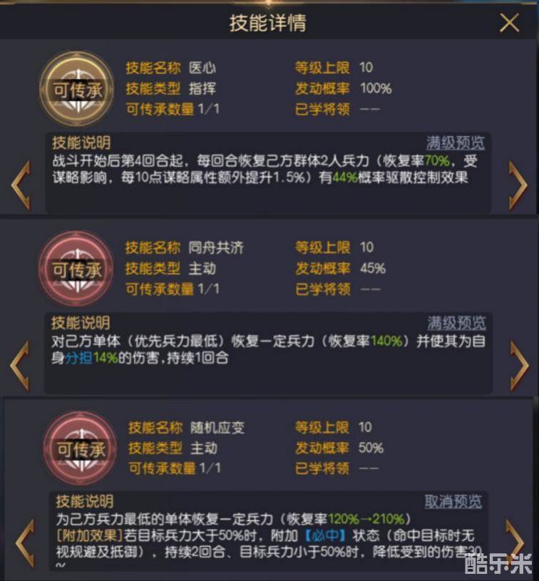 三技能还可以选择技能【随机应变】,可以为己方最低单体恢复120%的兵力,满级后高达210%。并且还有一个附加效果,若目标兵力大于50%,附加【必中】增益效果;若小于50%,降低所受伤害30%,这也是一个非常实用的恢复型技能,还附加额外的增益效果。