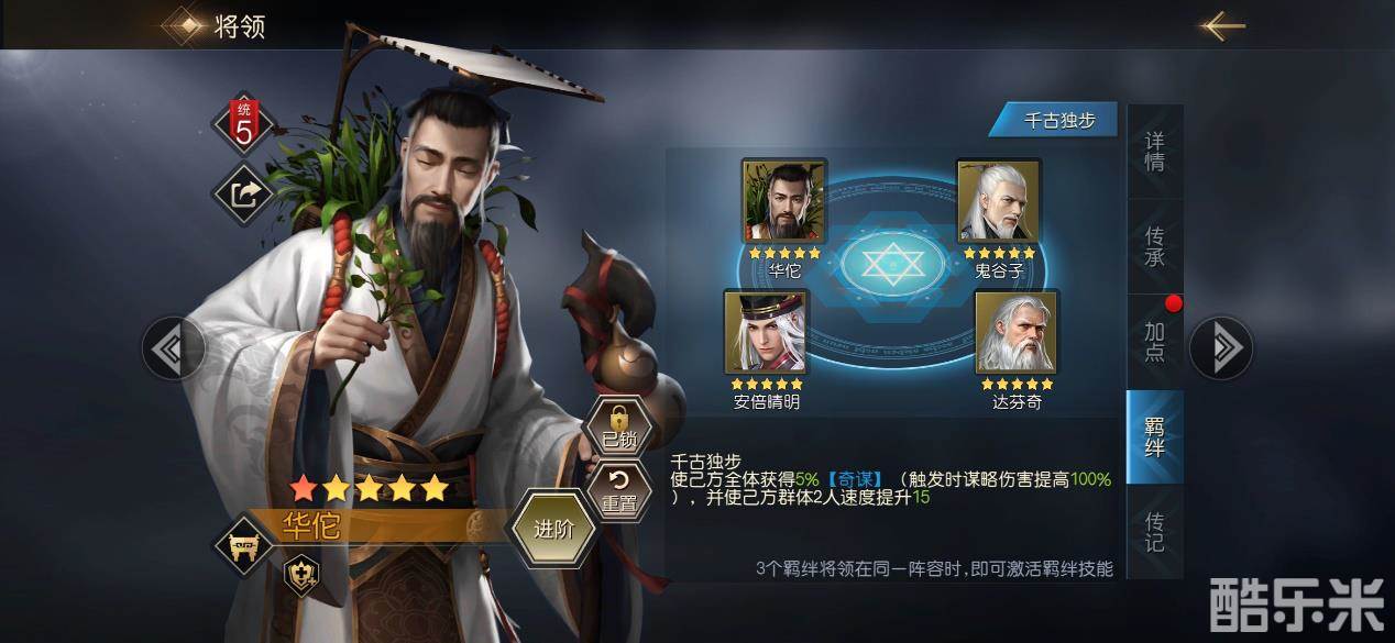 华佗、鬼谷子、达芬奇这三个将领在同一阵容时,可以激活羁绊【千古独步】,使己方全体获得5%概率的【奇谋】,触发时使谋略伤害提高100%,并使己方群体2人速度提升15。大家不要小看这5%的概率,【奇谋】一旦触发,技能伤害会成倍加成。