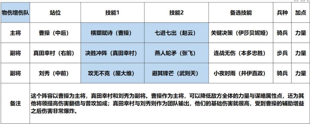 在阵容搭配时,推荐【曹操+真田幸村+刘秀】。这个阵容以曹操为主将,真田幸村和刘秀为副将。曹操作为主将,可以降低敌方全体的力量与谋略属性点,还为其他将领提高伤害翻倍与普攻加成;真田幸村与刘秀则作为团队输出,他们的基础伤害就很高,受到曹操的辅助增益之后伤害非常爆炸。