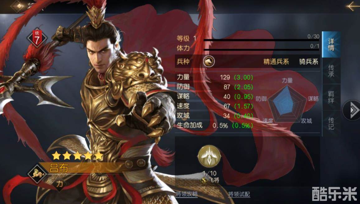 吕布作为物攻型输出的代表,拥有超高的基础力量和成长系数,基础防御属性和防御成长系数也可圈可点。吕布的技能输出伤害很高,伤害范围也非常广,可以攻击敌方全体将领,搭配上其他暴力AOE输出技能,可以享受以一敌万,扫清全场的快感。