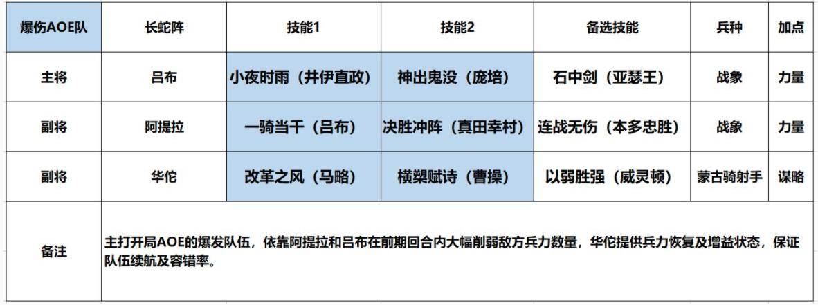 在阵容搭配时,推荐【吕布+阿提拉+华佗】。这个阵容以吕布为主将,阿提拉和华佗为副将。阿提拉自带技能【上帝之鞭】,使得主将吕布每回合必获得【群攻】状态;华佗为其提供兵力恢复,阵容的主要伤害就是以吕布的AOE伤害为主,首回合2波高伤害的AOE狂轰滥炸,后续稳定AOE伤害收割残局,战斗胜利变得非常简单。
