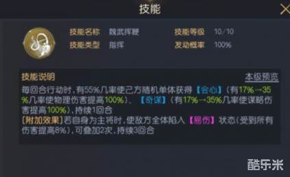效果分析:【魏武挥鞭】这个技能有两个效果,其附加效果使得曹操更适合担任主将位置,利用【易伤】增加敌方受到的伤害。曹操每回合都有较大几率附加我方将领【会心】和【奇谋】状态,使其造成的伤害翻倍提升,输出能力瞬间提升一个档次。