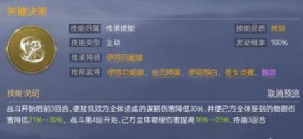 曹操的2技能则可以搭配技能【关键决策】,这是一个全面型的辅助技能。在战斗开始前3回合,降低敌我双方造成的谋略伤害并使我方全体受到的物理伤害降低,由于我方为物攻阵容,降低谋略输出毫无影响,但是若敌方是以谋略伤害为主的阵容,则形成了非常好的克制效果,大大限制了敌方的输出能力。同时【关键决策】从第四回合起会提升我方全体造成的物理伤害。