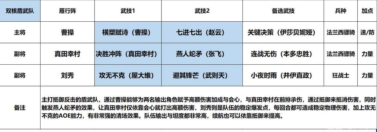 在阵容搭配时,推荐【曹操+真田幸村+刘秀】。这个阵容以曹操为主将,可以触发技能的主将效果,每回合都有几率使敌方陷入【易伤】,主要为团队提供增益状态以及伤害承受,真田幸村可同时担任输出与前排的效果,依靠抵御能够获得非常不错的承伤能力,在前四回合让刘秀稳定叠加技能释放次数,四回合之后依靠曹操高额的物理加成,让刘秀依靠兵种特性与技能效果打出成吨AOE,队伍爆发与持续伤害都比较稳定,坦度也很高。