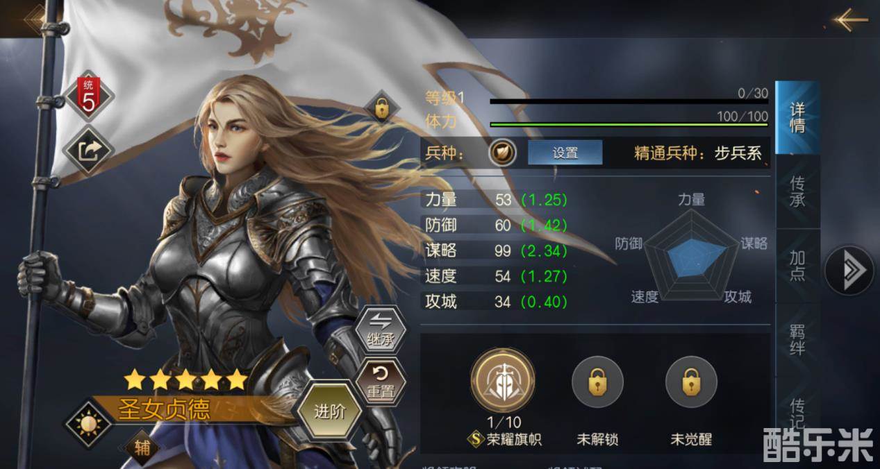 在所有阵容中,西洋阵容是包含辅助型武将最多的阵容。从自身属性上看,贞德与同阵容的同类武将相比,毫无优势。即便是基础属性值最高的“谋略”,也没有超过100。但贞德专属技能“荣耀旗帜”,弥补了贞德属性上的弱势,也使她成为了万金油型的辅助武将。