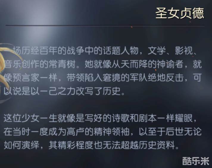 作为天主教的圣人之一,圣女贞德并非如同传统天主教徒那般,以身着长白衣或祭服的形象出现在文学、美术或是影视作品当中,而是一身戎装。这是因为贞德在英法百年战争期间,在法国最危急的时刻,亲自披挂上阵,率领法军反攻英军,并且多次获得了胜利。当时很多人都不敢相信,一个16岁的未成年小姑娘,竟然有着如此强大的影响力。《征服与霸业》中的贞德形象,亦是一名身着铠甲的少女。游戏中,贞德被定义为辅助型武将,是因为贞德在英法百年战争期间,以受到“上主的启示”为由,鼓舞了颓废的法军斗志,以“神启”之名,对英军发起反攻,收复了大片法国失地。