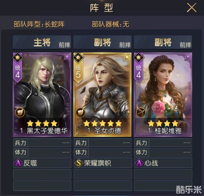 在前期阵容搭配上,推荐贞德放前排,再携带有治疗效果的技能。其他两名武将可以选择二输出或者一输出,一前排。在玩家前期橙色武将不多的情况下,可以选择“黑太子爱德华+贞德+桂妮维雅”。黑太子爱德华的技能“反噬”,在进入战斗后,可以直接获得力量和防御属性加成,并且在受到控制效果后,还有一定几率反制施法者,对其造成同样的控制效果,是前期非常优秀的前排武将;桂妮维雅的技能“心战”,可以同时造成一次物理伤害和谋略伤害,能最大化地利用“荣耀旗帜”同时增加物理和谋略伤害的效果。而且三名武将同属西洋阵容,在玩家建造“西洋崛起”建筑后,三名武将在战斗时,还能获得全属性10%的加成效果。