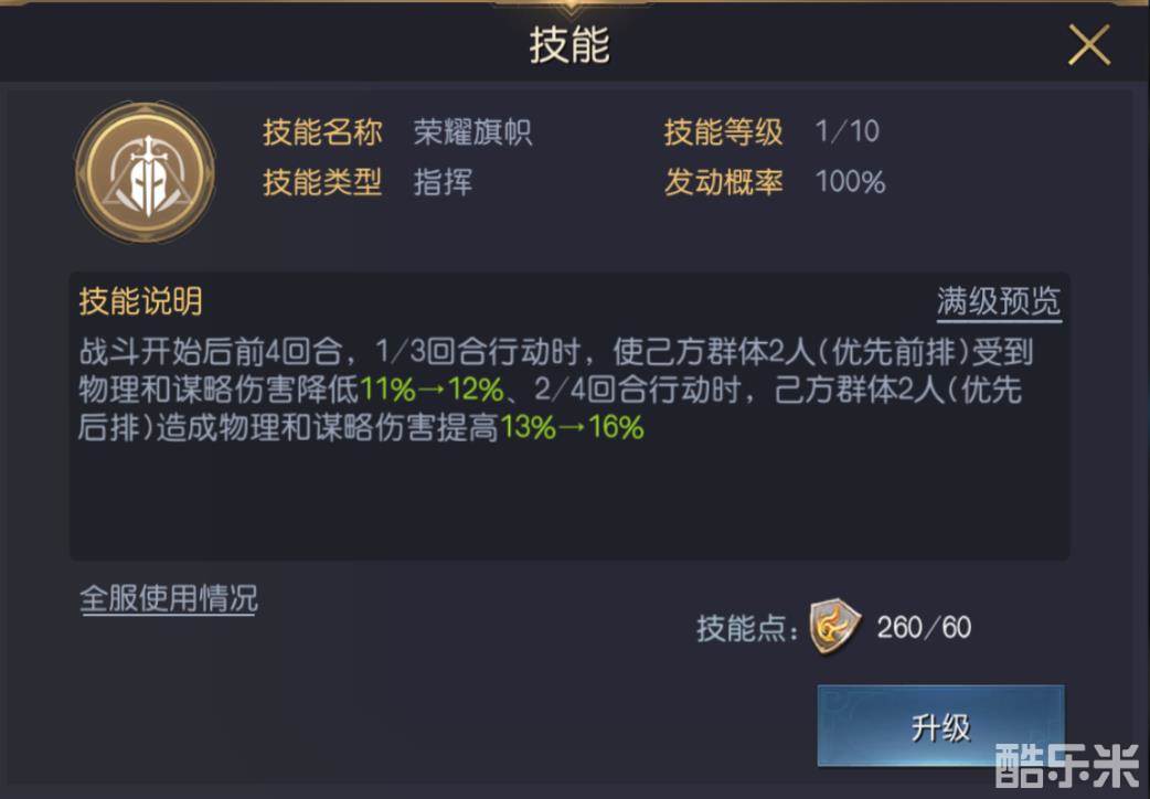 贞德作为一名辅助型武将,可以在前期时就快速登场作战,而且不需要花费太多的资源去培养。其专属技能“荣耀旗帜”是一个非常全面的辅助性质技能,不仅能够提升前排武将的坦度,还能提升后排武将的输出。这就使贞德在前期开荒打地的过程中,能显著降低队伍的战损,或者越级打等级较高的地块。