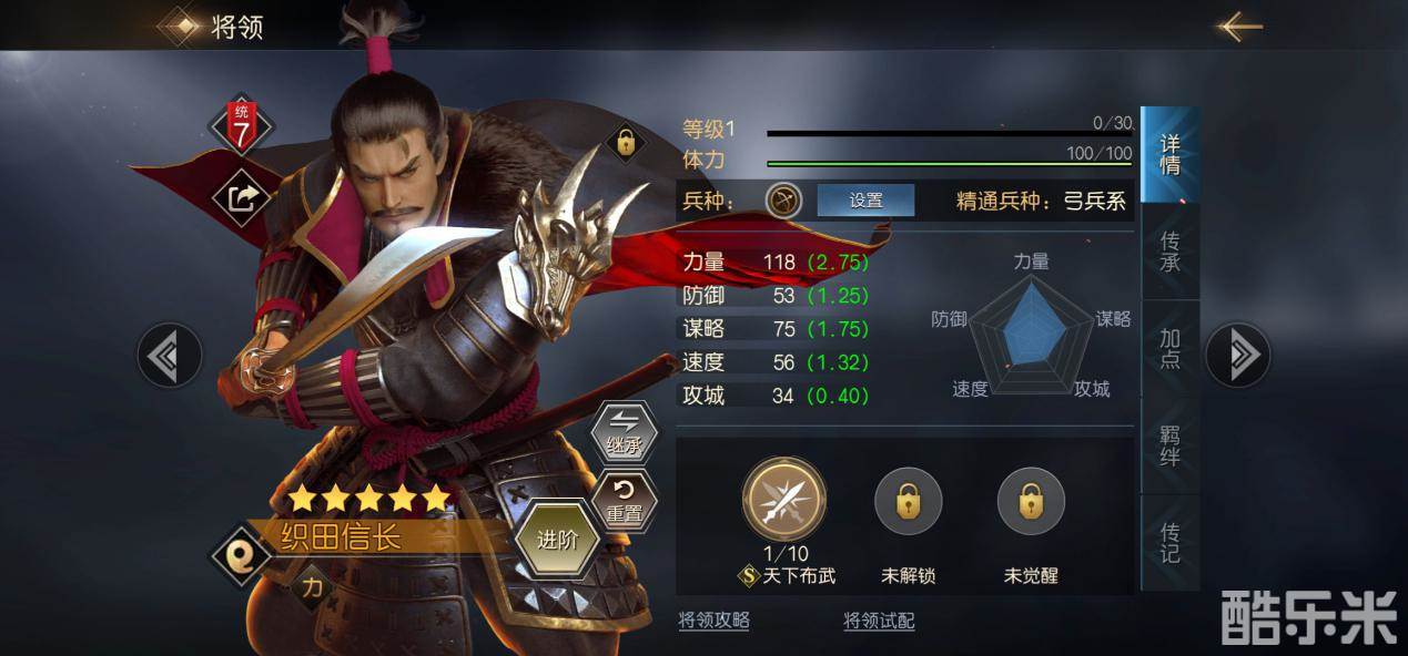 东瀛阵营中,织田信长的力量属性仅次于本多忠胜,达到了118点,属一流水准,即便和其它阵营同类武将相比也不落下风。信长的专属技能“天下布武”导致他更适合打前期,适合作为核心培养。