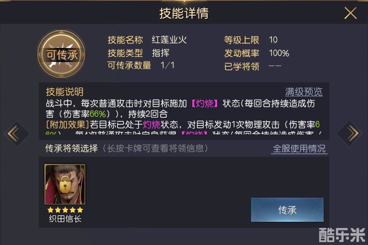 信长的一生,命中犯火。就像中国古代经历过多次兴佛灭佛一样,佛教常常因占用土地、社会劳动力等问题,与封建统治者产生矛盾,日本也不例外,这就有了信长的“火烧比睿山”事件。信长的归宿同样是火,本能寺之变中,信长于熊熊烈火中消失。“红莲业火”语出佛教,比喻烧尽罪恶之火。技能效果为,每次普通攻击对目标附加【灼烧】状态,持续2回合。如果敌人已经有此状态,那么对其发动1此物理攻击。需要注意的是,每4次普通攻击,自身也将获得【灼烧】状态,持续1回合。