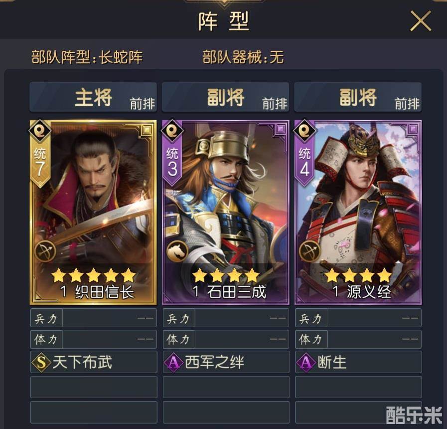 游戏后期,玩家橙色将领齐全的情况下,推荐队伍为“织田信长+酒井忠次+佐佐木小次郎”。