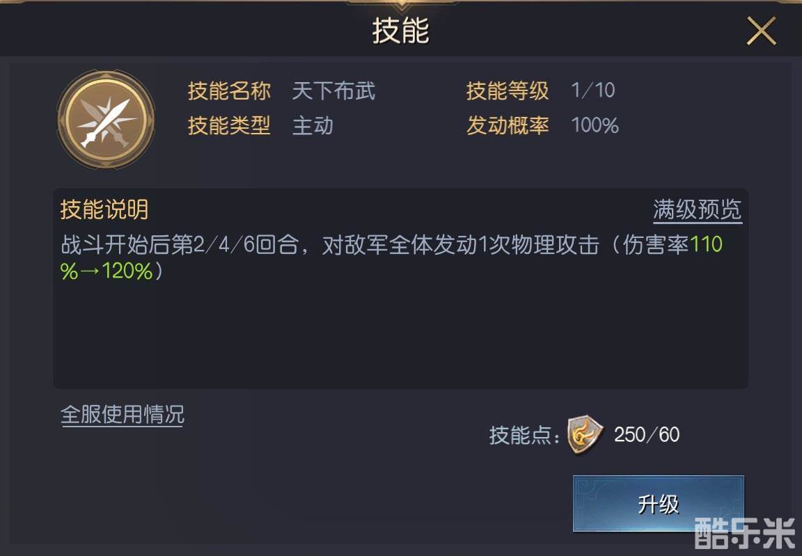 阿提拉的专属技能“上帝之鞭”,可以使自己与己方主将获得【群攻】状态,普通攻击时有50%几率攻击敌方群体,技能本身更偏辅助性质,优点是同时作用于2人。“天下布武”虽然隔1回合才能发动1次,但几率100%,伤害倍率极高,胜在稳定。