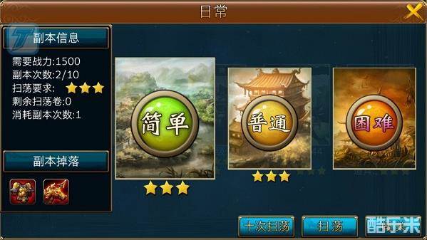 每个副本都有三种难度可供选择,”简单“、”普通“和”困难“,玩家必须达到副本要求的战斗力才可挑战。