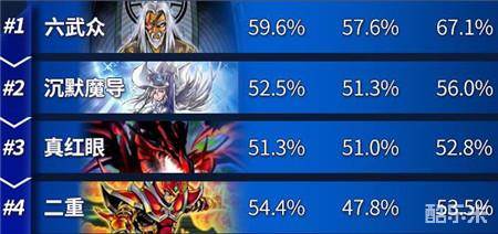 六武众以绝对优势的57.6%传奇胜率领跑胜率榜,这得益于其对上除真红眼外所有卡组均大优的现状