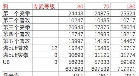 这里计算时,假设狗拳不受击,这里就只有三个UB。实际上,狗拳不受击是不太可能的,所以大家心里要有数,狗拳实际表现会更好。狗拳每多一个UB,伤害就能提高6W左右(由于后摇太长可能会损失一动)