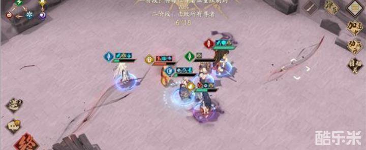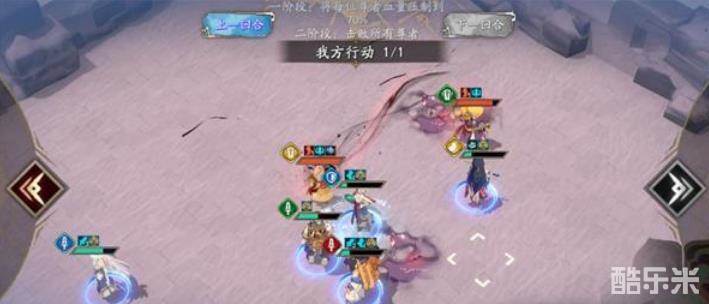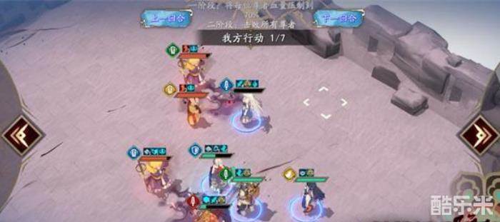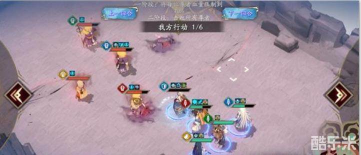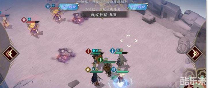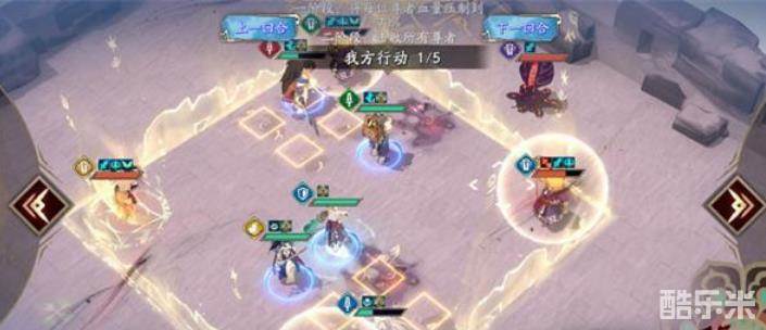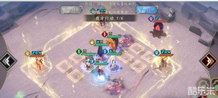 第5回合。冰璃对光咒师放幽剑,阴歙原地等待,白菀走到殷剑平右侧放神氛尉迟良对雷咒师放天机(反击后需要剩残血),殷剑平放日轮击杀雷咒师。敌动阶段,光咒师必定选择普攻尉迟良,阴歙抗住。