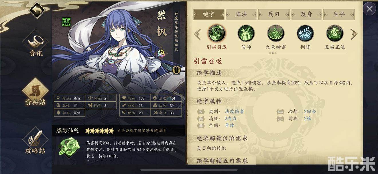 首先,紫枫自带的引雷召返是真的神级。看过接力赛跑嘛?这就是引雷召返的用处。紫枫可以跑到远处用引雷召返和未行动过的友军互换位置。