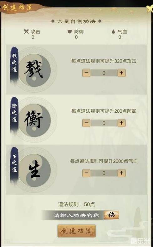 以自创六星功法为例,首先可供属性加点的共有50点,分为三种属性——攻击,防御和气血。在最大分配点数和最低分配点数相差不超过五的前提下,玩家可以根据自己的喜好随意分配。
