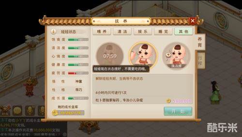 健康值较低时则会出现生病、失眠等症状,遇见这种情况则需要喂娃娃小儿灵,来提高娃娃的健康值。如果不想你的娃娃年幼就脱发,就要小心照顾别让他生病哦!有道友已经发现了,这些活动都需要消耗一定金钱,这个时候,没派上用场的丈夫就可以拿出来用了:“快去给我好好赚钱养家!”