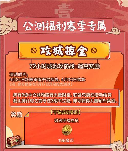 在福利赛季中,服务器初始开放4个出生洲和2个资源洲;剩余3出生洲和1个资源洲将逐步开放。所有3级中立城均藏有大量财富,活动期间,同盟只要在活动结算截止倒计时之前守住3级中立城,即可获得大量额外奖励——同盟所有成员将获得198金币活动福利。