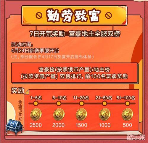 活动期间,每个服务器将根据君主的银币、资源进行全服排行,富豪榜与地主榜榜单中前100名的君主将可获得奖励。其中,每个榜单前5名君主将分别获得高达2500金币。