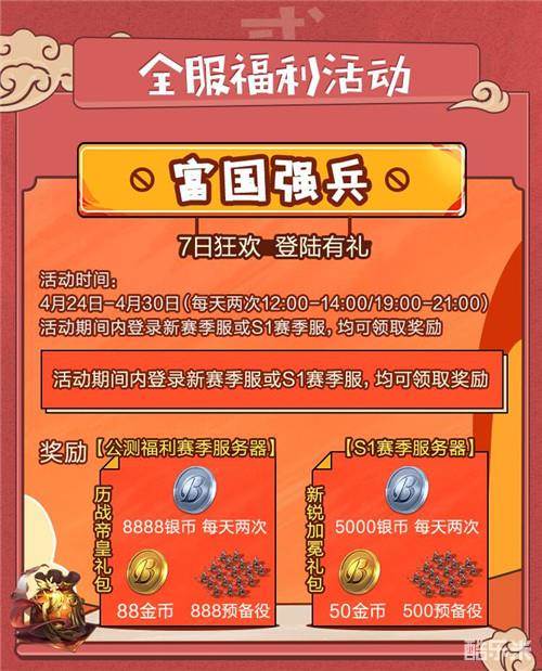 活动期间,所有新赛季服或S1赛季服的君主上线均可领取奖励。其中,在福利赛季服务器的君主,活动期间按时上线将能获得8888银币?、88金币、888预备役等福利。