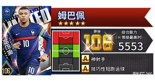 本次国家队精选球探中,姆巴佩的评分达到了惊人的106分,等级最高时的综合能力高达5553,能够完美胜任所有锋线位置,并携带有神射手、技巧性短跑运球等球员特技。实战中,姆巴佩就是速度与射门的结合体,让后卫追之莫及的同时,也让门将无可奈何。