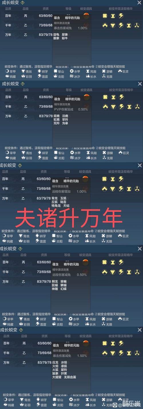 夫诸千年升万年,第一个千年印记和百年一样;第二个千年印记:旋龟、霸象、犀象、鲸牛。第一个百年印记:任意百年鹿、羚羊。第二个百年印记:鸡龙,任意蝙蝠,神雕,百年蝴蝶。