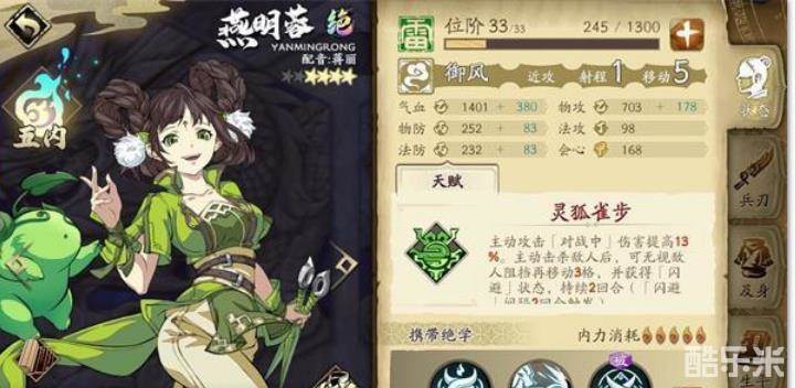 可以压回合5个人最后一个人动燕明蓉,这样【灵狐穿刺】到对面后排不会被集火且附带【闪避】同时还能削减对面脆皮目标的血量,下回合开始后5个人中第一个动【燕明蓉】用无视护卫的【疾风快刀】秒脆皮。【孤胆】能在燕明蓉切后排的时候最稳定增加攻击伤害。