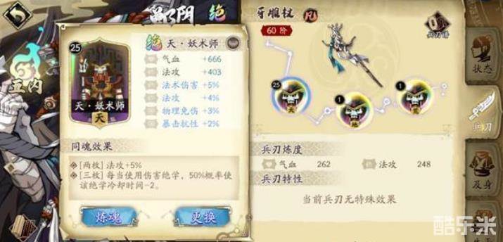 【妖术师】的三枚同魂效果有50%几率当使用技能造成伤害时,让该技能的冷却CD-2.,能让3CD的群体伤害技能【冥幻之阵】只要1CD,让郸阴的群体禁疗或者群体封咒更加频繁的扰乱对手。