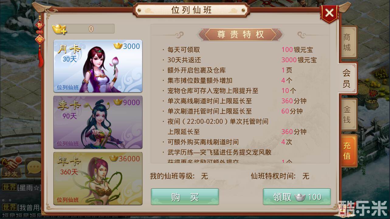 4、位列仙班:位列仙班玩家,每日可固定领取100-150不等银元宝