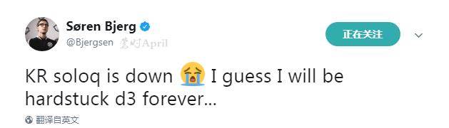 由于韩服排位段位上不去,北美法王Bjergsen在推特上感慨,觉得自己要永远卡死在钻3了