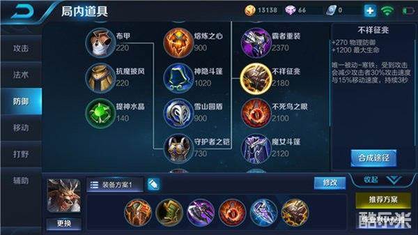 建议出装:抵抗之靴、红莲斗篷、反伤刺甲、不祥征兆、魔女斗篷、霸者重装
