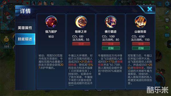被动-强力援护:被动是一个非常强力的增益技能,会给自己和范围内血量最低的队友带来较高的双抗加成。前期依靠被动可以给射手提供不错的抗伤能力,到了后期团战也能提升血量最低的那个队友的生存能力,这也是牛魔强势的原因之一。