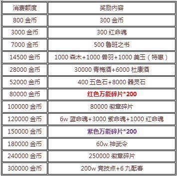 【活动内容】活动期间,游戏内累计消费达到对应金币,即可获得对应奖励;所有商品绝对超值,不信你自己看。相中哪个千万别手软!因为一犹豫也许就不知道何时能再见了。