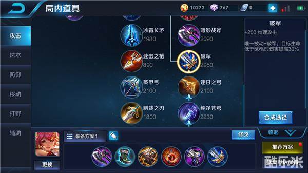 花木兰是一名战士而不是坦克,所以输出装也是十分必要的。在这种偏向坦克的出装下破军无疑是最佳的选择了,高额的攻击力加成与其唯一被动使得哪怕只有两件攻击装备的花木兰在后期依旧有实力秒杀敌方脆皮英雄。