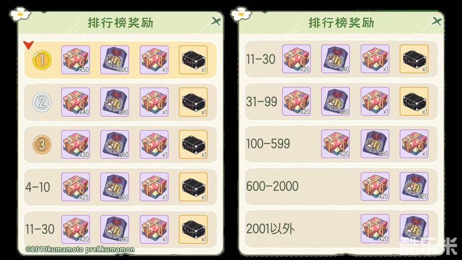 参加活动的村民可获得丰厚的游戏奖励,其中积分排行榜前99名的村民还可获得熊本熊雨衣礼包和熊本熊·英雄本色箱,在自宅放置本色箱可召唤迷你熊本熊。