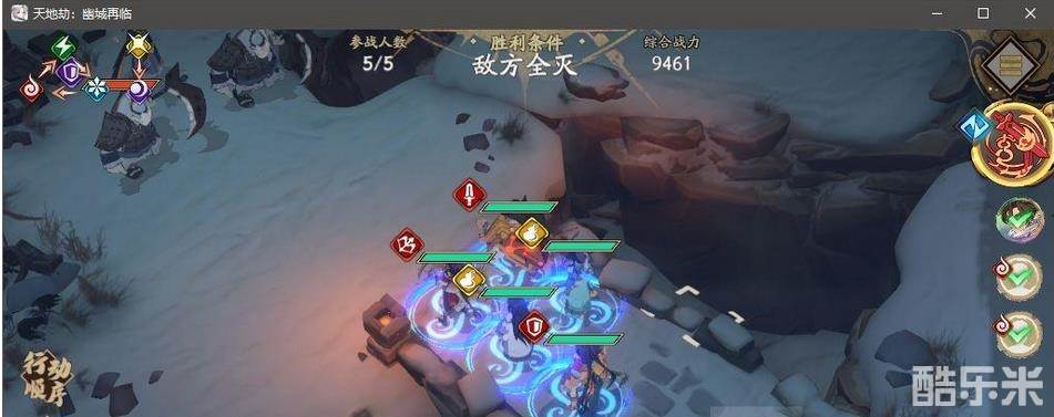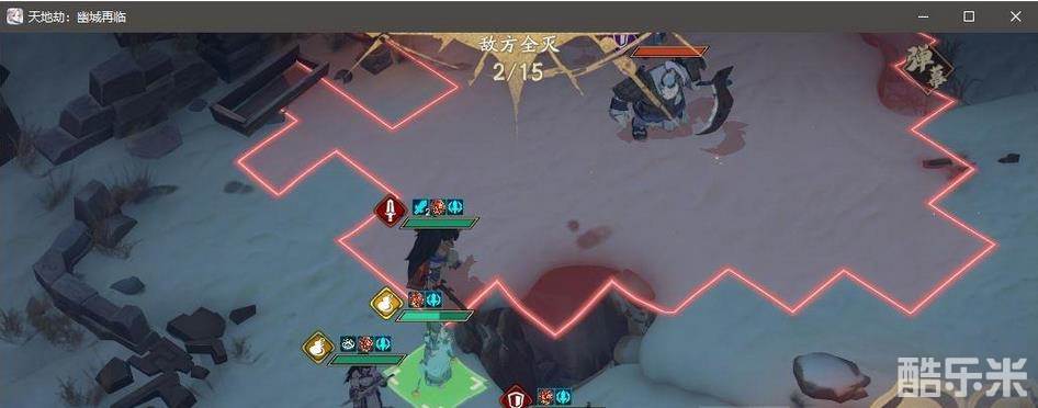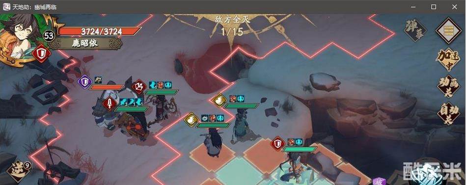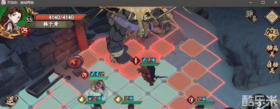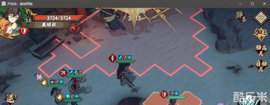 4回合,依依红圈外刚好能触发aoe的地方待机,6元贴圈提供协力,殷剑平在封妈能再动到的角落无方飞剑,再动殷剑平后贴近boss平砍(跟依依一条线),吃直线aoe,秀在另外一侧偷点伤害