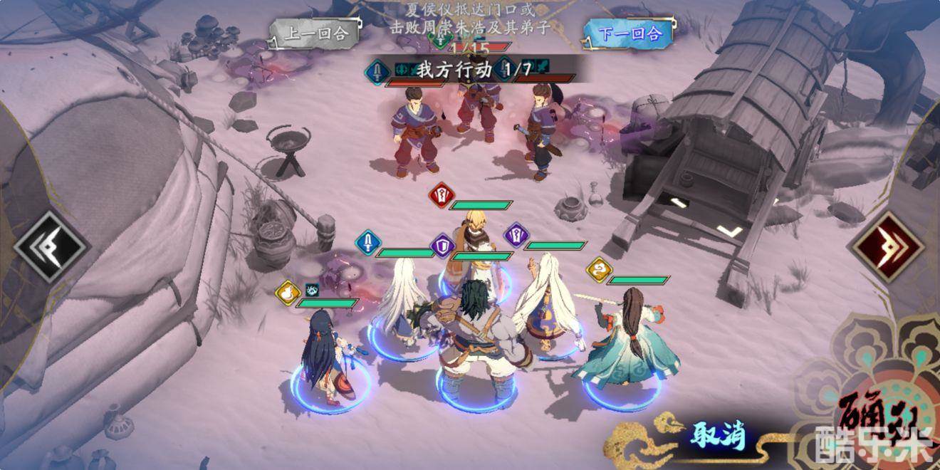 (2)第2回合殷剑平通过向左上走4格进入敌刺客攻击范围,触发赫兰铁罕向角色移动,同时冰璃和韩无砂击杀敌弓手。