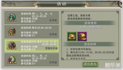 点击上方的“玩法”按钮,选择活动,并在活动中找到每日运镖,点击前往参加,即可自动寻路至活动位置。