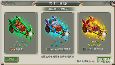 2、镖车分为青铜镖车、白银镖车、黄金镖车。每种镖车所需的花费不同,同时押镖成功后获得的奖励也不同。越高级的镖车获得的奖励越多。